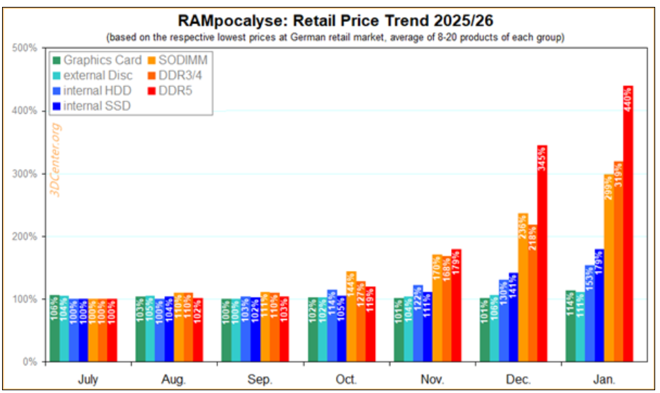 快科技1月19日消息,进入2026年,内存价格的上涨趋势并未放缓,根据3DCenter对德国零售渠道内存价格指数的最新更新,无论是DDR5、DDR4还是DDR3,价格都持续攀升。其中桌面级DDR5内存 ....