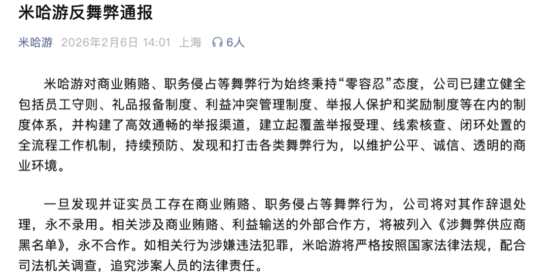 - 米哈游反腐:5人涉嫌商业贿赂、利益输送,24家供应商永不合作