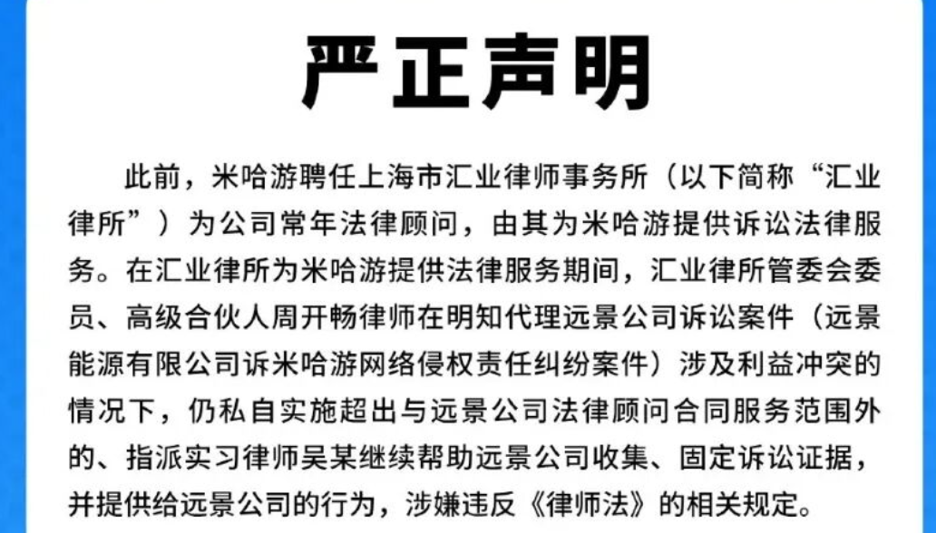 2026年2月10日,米哈游发布了一则声明。声明称,米哈游常年法律顾问,上海市汇业律所管委会委员、高级合伙人周姓律师在明知其代理远景公司诉讼米哈游网络侵权责任纠纷案件涉及利益冲突的情况下,仍为利益冲突 ....