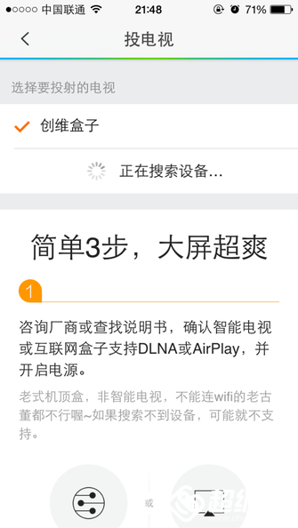 盒子支持DLNA和AirPlay协议,可以方便地将手机画面复制到电视机屏幕上。以腾讯视频为例,这款APP本身就集成了电视投射功能,只要盒子跟手机连接同一个无线局域网,APP即可搜索到这款盒子,选择好你要投射的设备后,接下来就让手机直接播片。