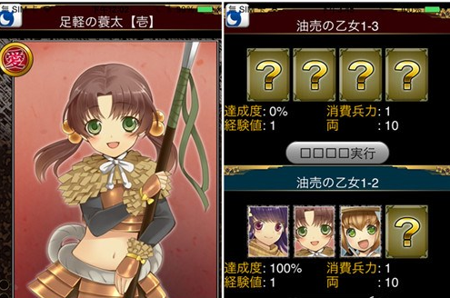 《战国武将姬-MURAMASA-》主要是需要玩家解决任务、战斗和活动,其中还包括了被称作“乐市”的义卖会系统和行会系统等,玩家在乐市中玩家可以交换卡牌。完成任务可以获得金钱和合成材料,训练武将投入战斗和任务。另外玩家的属性“信仰”不同,任务中经常出现的武将也会产生变化。每完成一个区域就能获得重要道具“回复桃”。