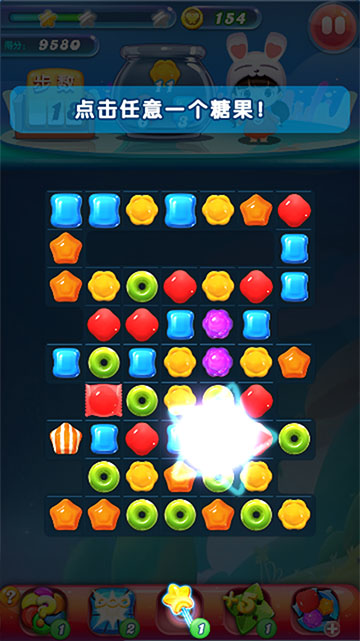 全部的玩法就是消除连连看,通过交换糖果,使得三个或以上相同颜色的糖果同时存在在一个横列或者竖列,达成消除。并且直线上的四个或者五个相同颜色的丁字形糖果,达成消除会获得一个条纹糖果,条纹糖果的消除会影响范围同颜色的糖果。