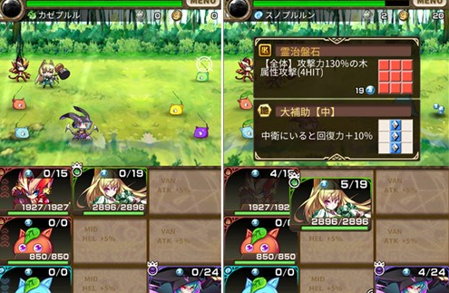 游戏的操作十分简单,单手触摸滑动屏幕即可轻松战斗。每个角色都有特定的必杀技,当角色的能量值攒满后,向上滑动角色即可发动必杀。每个角色和其他同伴攻击范围、属性相配合,最多可发动六连击。敌人的攻击顺序可以由玩家自己来决定,点击要攻击的敌人即可,点击后,如果我方队员的属性与之相克便会显示出来。比如敌人是水属性,那么我方木属性的同伴旁边就会出现向下的箭头,代表攻击力会降低;而火属性的角色就会出现向上的箭头,表示效果拔群。