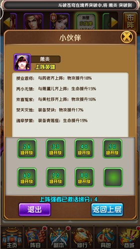 《斗破苍穹》的操作异常简单,进入副本后全程自动战斗,玩家只需点击一下快进即可。游戏性并不是很高,与其他卡牌游戏类似。所有的玩法都在战斗前的准备工作上,比如排兵布阵,升级进阶等。