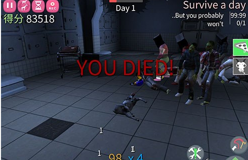 在本作提供的生存模式中,玩家的目标就是不断的活下去,虽然游戏还是没有告诉我们除了获得更高的分数探索更多的内容之外到底有没有一个通关目标。玩家需要不断的吃东西,否则会饿死,僵尸的攻击性也比原来弱不禁风的人类强了很多,同时还得搜集各种资源合成6种武器来消灭更强大的僵尸。