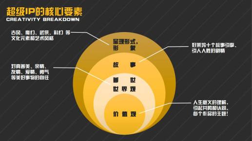 娱乐资本论曾发表过《究竟什么才是有价值的IP?》中,提到了“IP引擎”这个重要的概念。一个具有可开发价值的优质IP,应该包含由外至内的4个层级,它们分别是:呈现形式、故事、世界观和价值观。前期开发的层级深度决定了作品的价值,也决定了作品是否能成为真正的常青IP。
