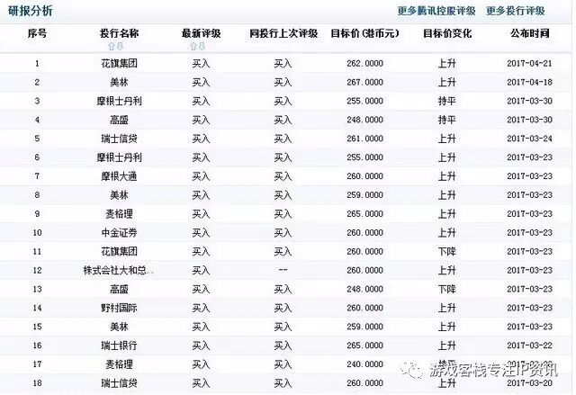 虽然腾讯市值达到了里程碑的3000亿美元,但是投行仍普遍看好腾讯股价。花旗、高盛等均在近一个多月内,给出“买入”评级,并指出腾讯仍有上升空间;麦格理维持目标价265元,评级‘优于市场’不变。德意志银行上调腾讯目标价2.4%,由242元升至247元,评级维持“买入”。