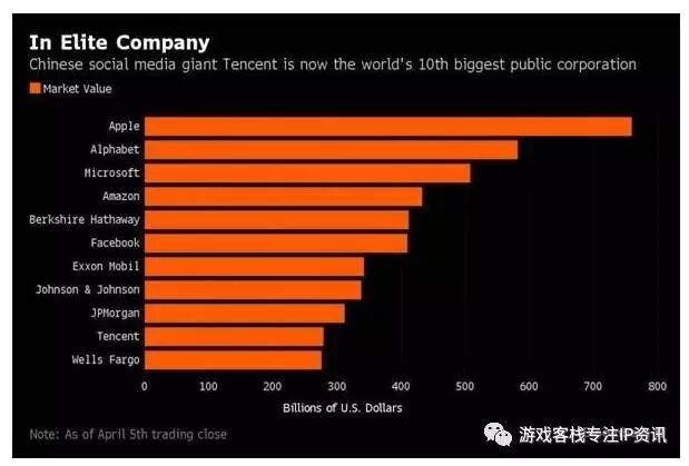 今年4月6日,腾讯市值曾达到2790亿美元,超越美国富国银行,成为全球第十大市值公司,跻身全球十大市值上市公司,也是唯一晋身十大的中资企业。