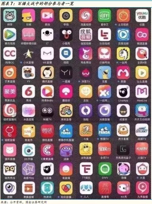 除了上述头部平台外,涌现于2014年-2016年间的直播平台多如过江之鲫,其中不乏知名厂商旗下产品,如腾讯的NOW直播、花样直播,阿里的来疯直播、淘宝内部直播功能,百度的百秀直播、奇秀直播,一下科技的一直播,中国移动也推出了咪咕直播。还有更多的直播平台,则是搭乘移动互联网东风入场的草根参与者。传统的长视频、视频聚合平台,也纷纷推出了直播功能或子应用。2016年是从业者和用户公认的“移动直播元年”,据我们的不完全统计,当年在国内提供直播服务的厂商超过200家,“百播大战”的典故由此诞生,成了中国互联网发展史上的经典一幕。