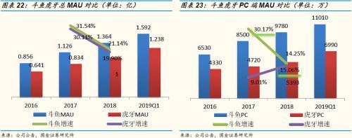 根据斗鱼和虎牙的官方公告,从2016年开始,斗鱼的总MAU一直领先于虎牙。2019Q1,斗鱼总MAU达到1.592亿,虎牙为1.238亿。斗鱼的MAU优势主要来自PC端——2019Q1斗鱼PC端MAU为1.1亿,虎牙仅为6990万。这离不开当年斗鱼在PC端的先发优势。