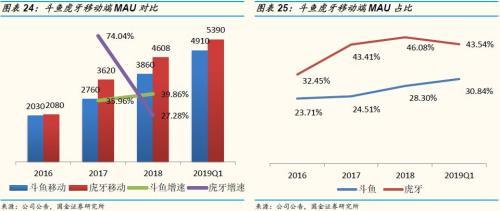 在移动端,情况则正好相反:自2016年至2019Q1,虎牙移动端MAU都高于斗鱼。2019Q1,虎牙移动端MAU为5390万,占了总MAU的43.54%,比2018年略有下降;斗鱼移动端MAU为4910万,占比30.84%,比上一年略有提升。斗鱼移动端MAU增速从去年开始高于虎牙。