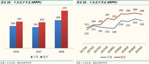 虎牙的用户ARPPU也高于斗鱼。2018年,斗鱼ARPPU为208元,虎牙ARPPU为279元,2019Q1斗鱼ARPPU为226元,虎牙为288元,从2018Q1开始,斗鱼与虎牙季度ARPPU的差值基本维持在60以上。综上所述,斗鱼的用户总数高于虎牙,但是优势主要在PC端;虎牙的移动用户总数、总付费率和ARPPU都高于斗鱼。