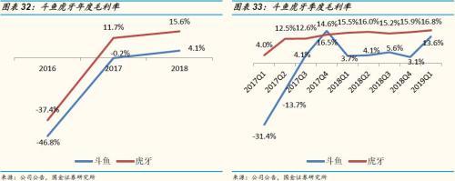 虎牙的毛利率水平领先于斗鱼,2018年,斗鱼毛利率为4.1%,虎牙毛利率为15.6%,是前者的3倍多。2019Q1,斗鱼毛利率为13.6%,虎牙毛利率为16.8%,两者差距大幅度缩小。可以看到,在上市前夕,斗鱼在提高盈利能力方面做出了很大努力。