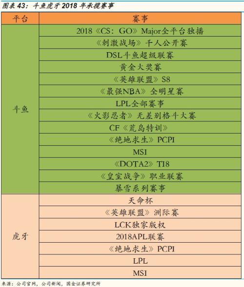 斗鱼对头部赛事的掌控领先于虎牙。根据我们的不完全统计,2018年斗鱼承揽的电竞赛事数量超过虎牙。例如,斗鱼自家举办的黄金大奖赛已成为《绝地求生》FSG的中国区预选赛。在《CS:GO》《最强NBA》《火影忍者》等腰部游戏品类,斗鱼也在组织大型赛事,这在直播平台中是颇为难得的,有利于形成多层次的观众基础。