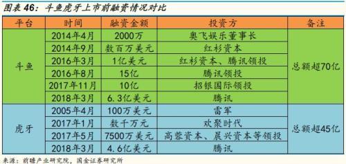 双雄争霸旷日持久,能厮杀到现在而没有分出胜负,足以说明两者各有千秋。斗鱼上市前总融资金额超过70亿人民币,高于虎牙的45亿人民币,且腾讯对其投资的金额更高。但是虎牙率先登录资本市场,成为游戏直播第一股,而且在收入、盈利能力方面都略胜一筹。