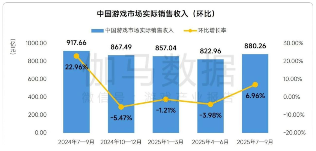 10月24日,伽马数据发布了《2025年7—9月游戏产业报告》(后简称“报告”)。报告指出,2025年第三季度,中国游戏市场实际销售收入为880.26亿元,环比增长6.96%,但同比下降4.08%。收 ....