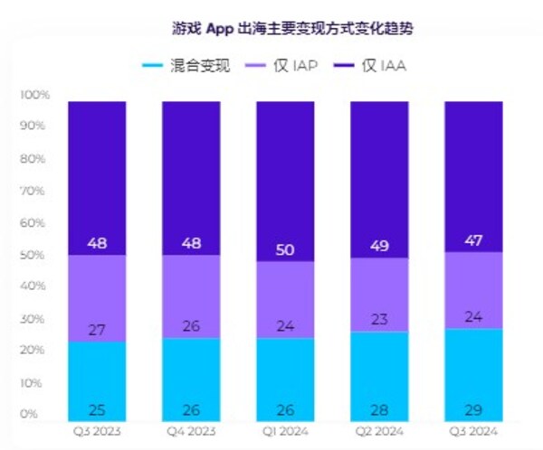 中国手游出海的主要变现方式在过去五个季度呈现出显著的变化趋势。首先,混合变现模式呈现持续增长趋势,从 2023 年 Q3 的 25% 增加至 2024 年 Q3 的 29%。这表明越来越多的手游开发者选择通过广告收入(IAA)和应用内付费(IAP)相结合的方式来获取收益。