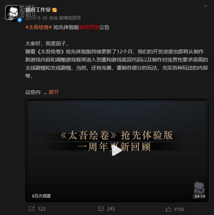19年9月底,螺舟工作室微博宣布了一条闭门开发公告,将暂停游戏玩法更新,转向重构游戏代码。当时螺舟手上只有这么一个要推翻重做的《太吾绘卷》。除此以外,工作室没有别的挣钱门道。