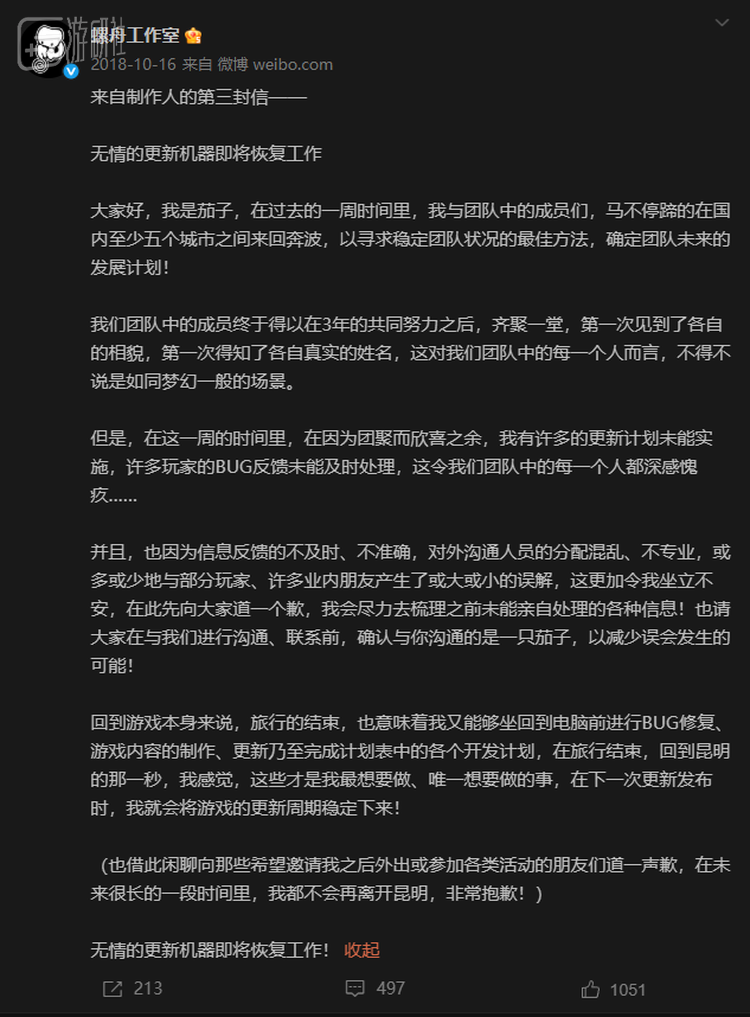 有些外界看似尚有余地的节点,在茄子看来其实并没有选择。对于为什么一定要在约定的时间更新,茄子的回答是:“不想失信于玩家。”