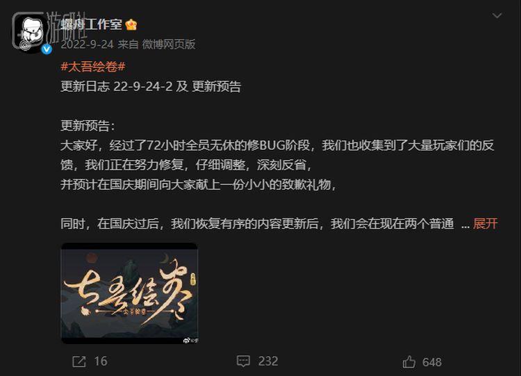 三个月后,螺舟工作室发微博宣布,《太吾绘卷》正式版将在当年9月上线,引发了大量网友关注。这本应是螺舟苦尽甘来的关键一年,一切看似顺利向前推进。