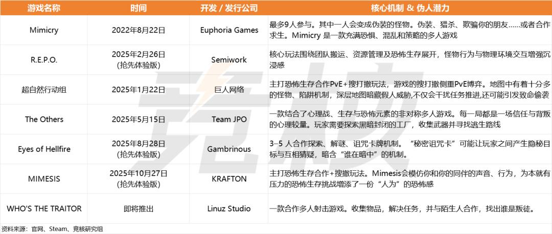 聚焦恐怖生存合作、伪人玩法,我们会发现,市面上的产品不乏少数。但大家在切入点上仍有所不同。
