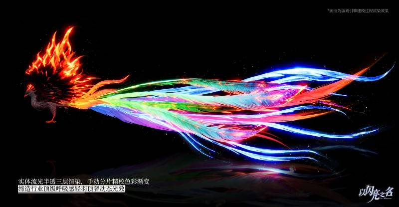 神鸟坐骑的制作更是技术与匠心的结合,为了兼顾生物形态的合理性与幻想美学的冲击力,技术团队以真实鹰类骨骼为基础架构,融合多种鸟类的形态特征,构建出兼具力量感与优雅感的神鸟模型。而不死神鸟的万千羽毛,均采用插片工艺手动逐片调整分布与走势,仅尾羽部分就经过了上百次色彩调试,通过手动修改每根尾羽关键顶点的色彩值,实现了红色向金色、金色向蓝色的自然渐变,再叠加实体+流光+半透的三重特效,最终呈现出如神圣呼吸般的灵动质感。