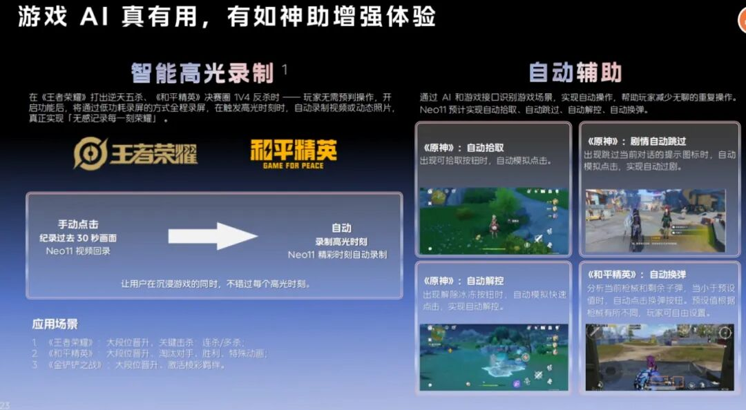 现在,使用iQOO Neo11,在《王者荣耀》里打出五杀操作,或者在《和平精英》决赛圈1V4时,智能高光录制功能会在触发高光时刻时,自动录制视频或动态照片。