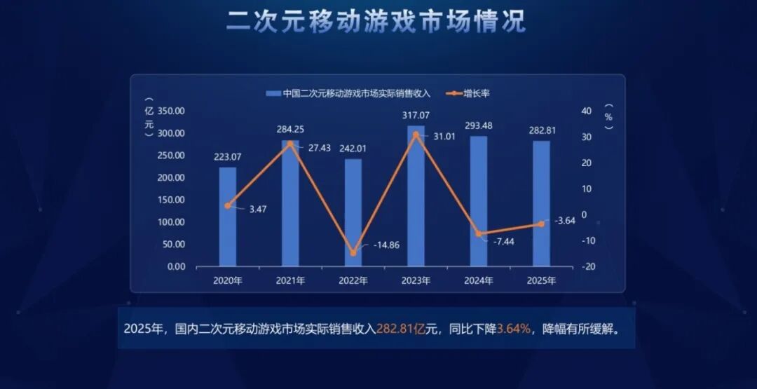 这种现象,表现最突出的就是二次元赛道。据《2025年中国游戏产业报告》显示,2025年二次元游戏规模连续第二年出现下滑,下滑3.64%。
