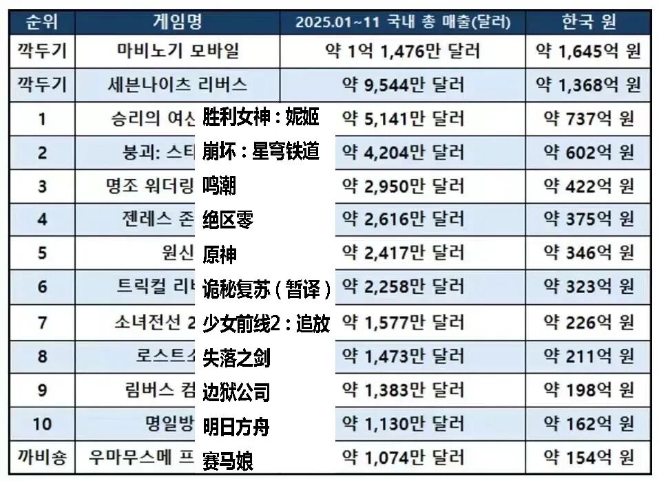 值得一提的是,中国二游在韩国如今已处于“支配地位”。据韩媒体最新排名统计,2025年韩国二次元游收入前五名有四席被中国游戏包揽。如果将第一位的NIKKE也算上腾讯的投资,那就是4.5个名额全被中国占据。