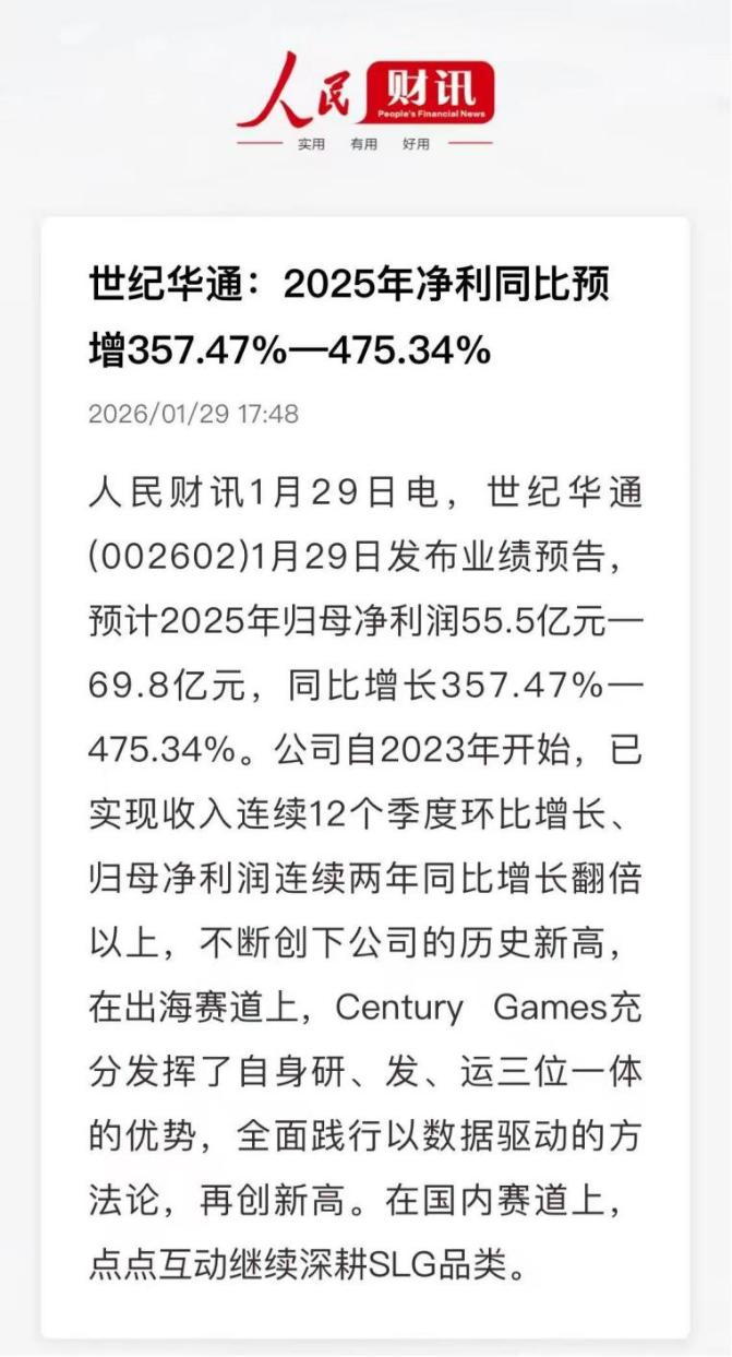 直到1月29日晚间,世纪华通再发公告,预计2025年净利润同比增长357.47%-475.34%,营业收入为380亿元。此时我们再将两个公告的数据进行对比,发现与腾讯的合作收入只占世纪华通2025全年总收入的10%左右,终于让很多行业内外的朋友看到了它的真实体量,也让更多人对世纪华通这家企业产生了好奇。