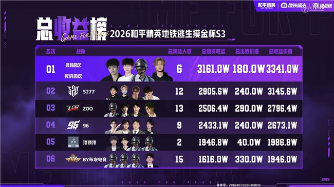 四排赛道中,“数码园区”战队堪称本届赛事中的最大黑马。小组赛阶段,这支战队仅以第三名晋级半决赛;半决赛最后一局中,队内选手“炖炖”在距离上一名仅差26w收益的关键时刻,通过清BOSS和开出金枪后成功撤离,帮助战队反超“359”战队获得B组第三名,拿到复活赛资格,并在复活赛中以第二名成功拿下决赛资格;决赛中,“数码园区”战队依然秉持稳定搜刮的战术,在第三局中以“一局开二金”奠定了收益基础。虽然最后一局中遭遇“BY布衣电竞”和“5277”两支战队的夹击而提前退场,但“数码园区”战队依然凭借前期运营积累,最终以3341万总收益斩获冠军。