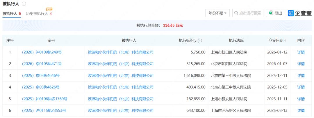 而游戏的失利也将公司拖进了泥潭。自2025年起,波波和小伙伴们的(北京)科技有限公司及其关联方因拖欠薪资、游戏推广费、美术外包费等,被多方告上法庭。这些案件已陆续公布判决,公司新增多条被执行信息。