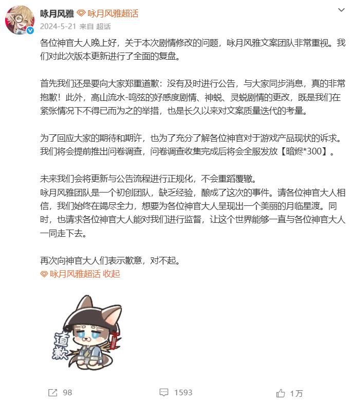 同时,官方运营的「骚操作」也加剧了玩家的不满。例如开服后未告知玩家便擅自修改剧情卖腐,后续被发现才滑跪道歉,可以说精准踩中用户雷点。