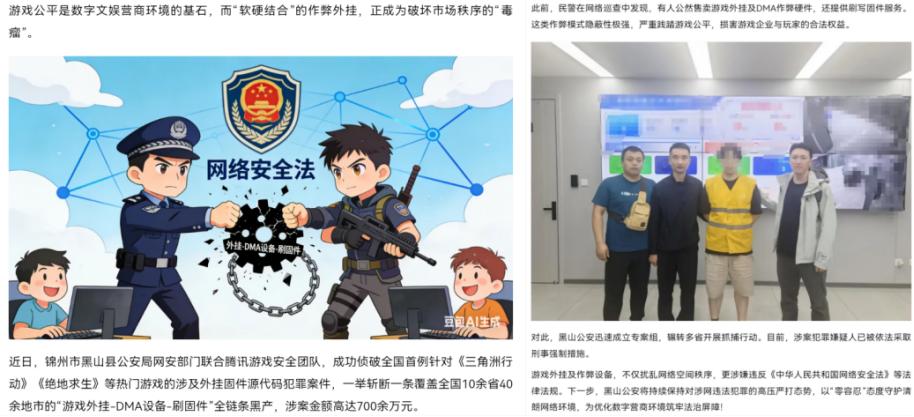 反观国内,则通过司法实践将制售外挂纳入刑事打击范围,形成了有效的保障体系。黑产主要触犯两类罪名,一是早年经常使用的侵犯著作权罪(针对修改游戏核心代码制售作弊程序牟利);二是近两年针对硬件外挂定性,“公安部网安局”公众号曾明确指出硬件外挂“严重破坏游戏的公平性与完整性”,涉嫌违法犯罪。当下全国各地公安机关发布的案件通报内容,也体现出对制作、销售硬件类外挂的行为,基本以涉嫌提供侵入、非法控制计算机信息系统程序、工具罪论处,清晰的法律定性为全链条打击提供坚实依据。