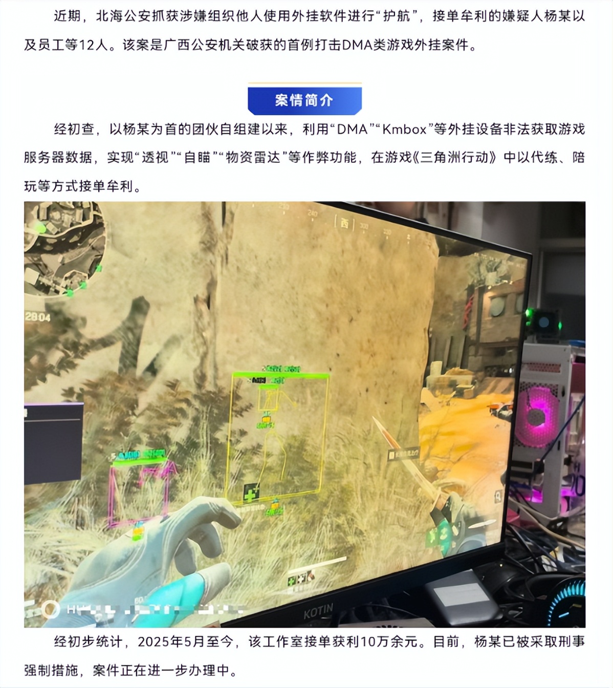第二,在形态层面,黑产盈利模式从售卖工具转向“作弊服务化”以规避监管。例如广西北海《三角洲行动》陪玩工作室案中,杨某团伙利用DMA外挂提供“透视”“自瞄”等功能,以代练、陪玩名义牟利,最终12名核心成员被抓,该案系广西首例DMA外挂打击案。