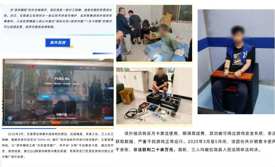 再如江苏盱眙DMA外挂案,其线索正是源于一位资深射击游戏玩家在测试“JR”DMA外挂过程中,察觉该外挂已明显突破技术研究或个人使用范畴,存在严重违法嫌疑,遂主动携带完整外挂设备及相关资料向公安机关报案。警方据此循线深挖,最终成功捣毁一个集外挂开发、销售、分发于一体的黑色产业链,涉案金额达300余万元。