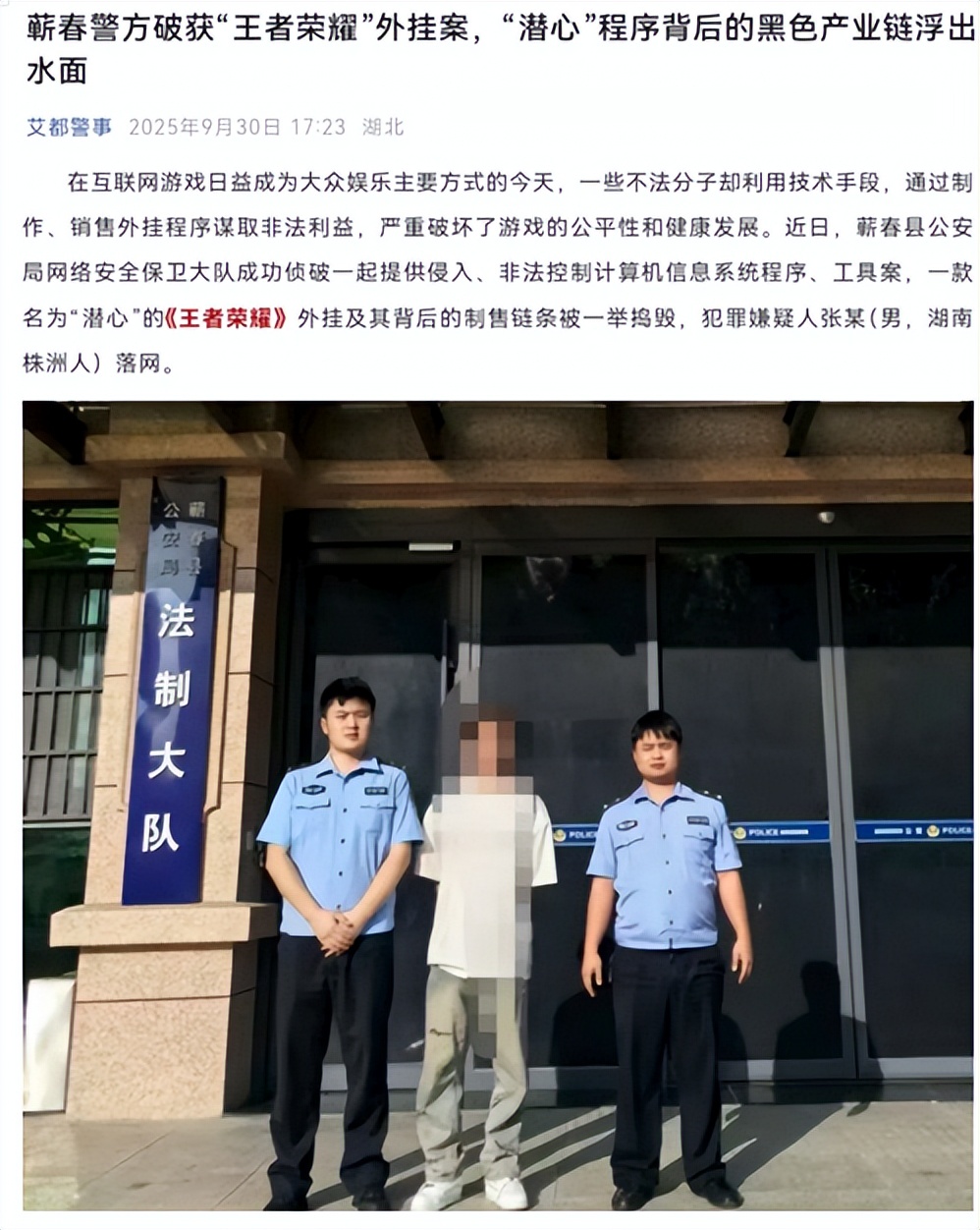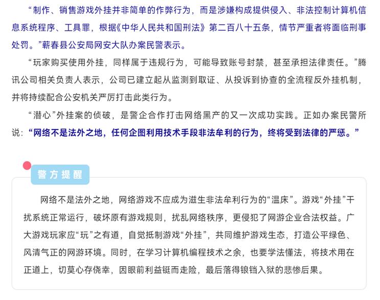 因此,国内反作弊治理逐步构建起“警企协同+全链打击”模式的核心优势。以腾讯游戏安全团队为例,在技术上系统构建监测、取证、固定证据体系,通过ACE防护系统实时监测外挂,确保证据不可篡改,为警方提供技术支持。打击策略兼顾“广度覆盖”与“精度打击”:广度上覆盖全平台,针对多款热门游戏制定专项方案,2025年上半年处罚黑产账号8493万个,同比上升20.6%;精度上聚焦核心环节,如25年9月,蕲春警方联合腾讯抓获《王者荣耀》“潜心”外挂开发者张某,该案非法获利5万余元,涉案用户超2000人。