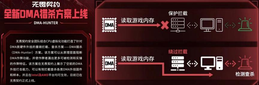 针对DMA硬件外挂,行业实现技术突破。《无畏契约》DMA-Hunter方案利用CPU虚拟化阻断作弊,适配Intel、AMD平台,上线后两周封禁DMA作弊账号1.1万个,玩家反馈“神仙玩家”显著减少。