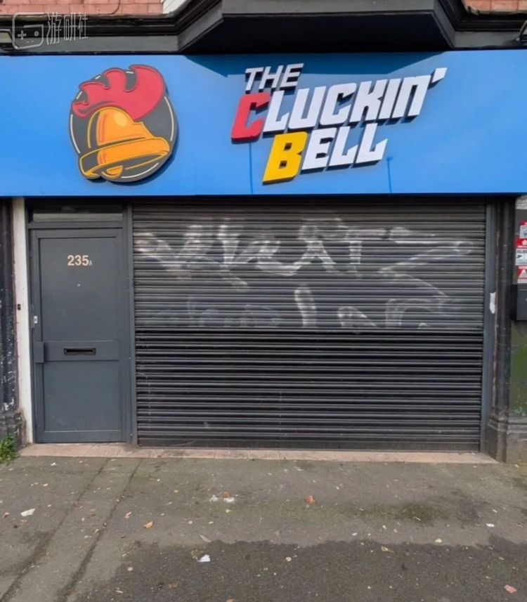 这家餐厅从名字到Logo,几乎一比一地复制了GTA里的炸鸡连锁店Cluckin' Bell。由于过于相似,这家店刚刚被发到网上时,还有网友认为这是为《GTA6》进行的一次街头预热。