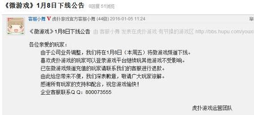 游戏客栈今日报道(2016.1.6)近日消息,虎扑体育游戏中心发布公告表示,由于公司业务调整,虎扑将于1月8日将微游戏频道下线。其停运公告如下: 各位亲爱的玩家: 由于公司业务调整,我们将在 ....