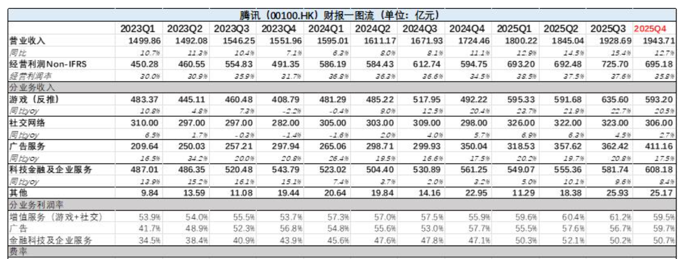 3月17日尾盘,腾讯发布了2025年四季度财报,营业收入录得1943.7亿元,同比增长12.7%,略高于市场一致性预期,净利润为582.6亿元,同比增长14%,经营利润率35.8%,与预期基本一致。( ....