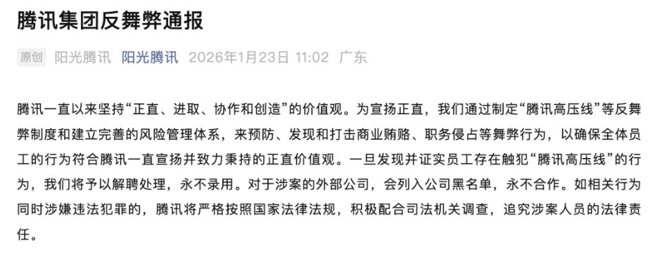 腾讯2025年反腐通报:70余起案件、90余人被辞,游戏与营销成重灾区