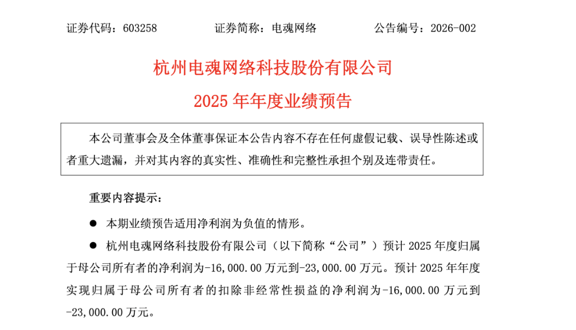 1月21日,电魂网络披露2025年业绩预告,预计将迎来大幅亏损。据初步测算,电魂网络2025年归母净利润区间为-1.6亿元至-2.3亿元,扣非后净利润亦为负值。业绩预告指出,亏损主要源于全资子公司厦门 ....
