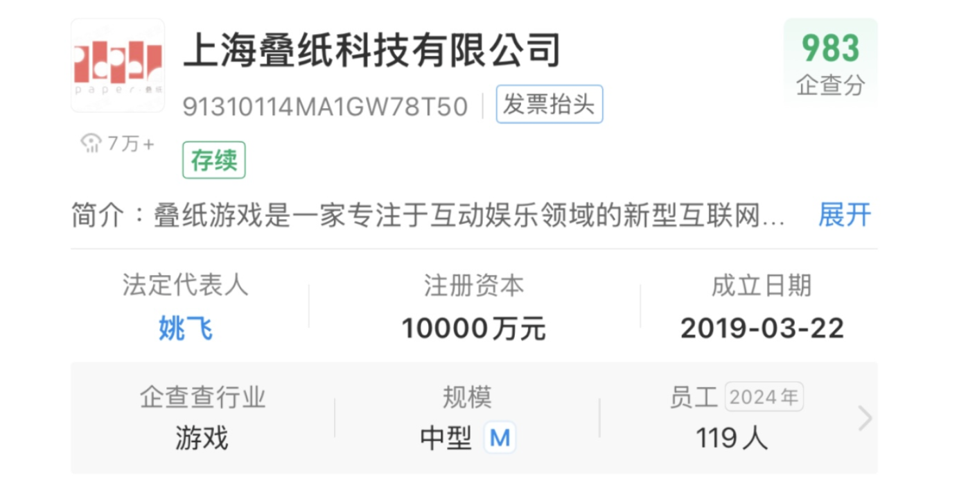 游戏陀螺获悉,企查查App显示,近日上海叠纸科技有限公司发生工商变更,姚润昊卸任该公司法定代表人、执行董事,由姚飞接任法定代表人并担任董事。公开资料显示,上海叠纸科技有限公司成立于2019年,注册资本 ....
