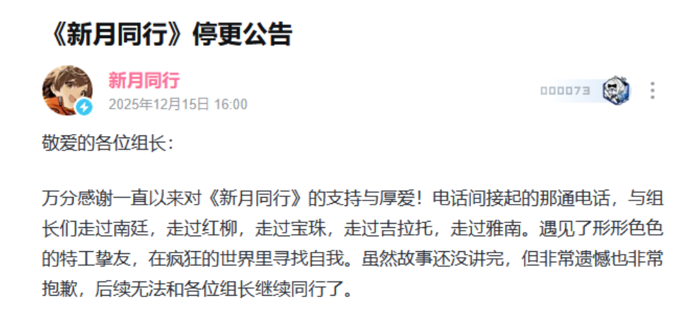 - 倒在2026前夕,二游《新月同行》宣布停更
