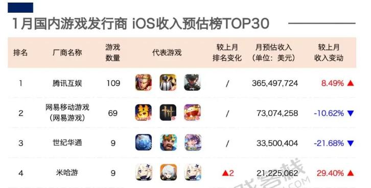 - 1月游戏公司营收30强