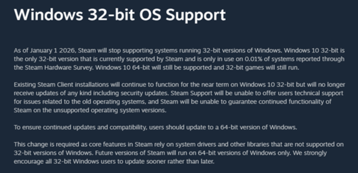 - V社官宣:Steam客户端2026年1月1日起停止支持32位Windows系统