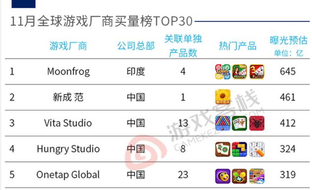 - 11月全球手游核心数据榜 收入+下载+买量榜三维解读